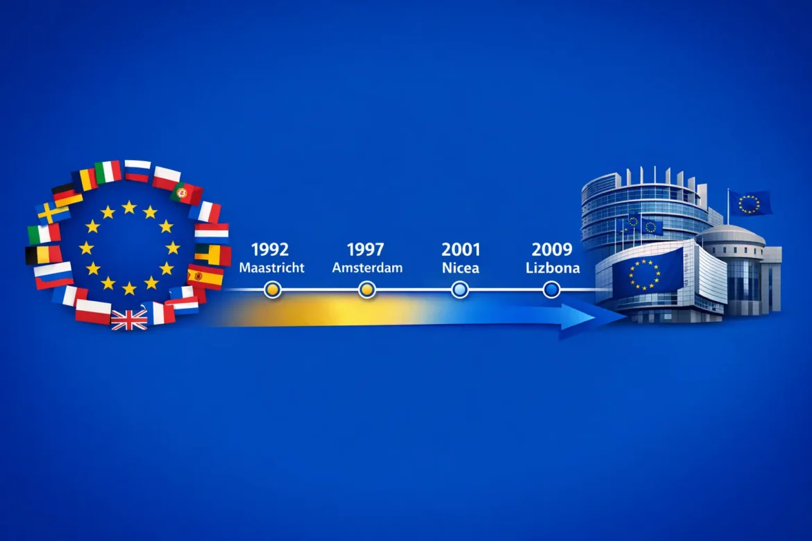 Unia Europejska przez ostatnie trzydzieści lat przeszła głęboką przemianę, która dokonała się nie poprzez rewolucje ani gwałtowne zwroty, lecz przez kolejne traktaty międzynarodowe.